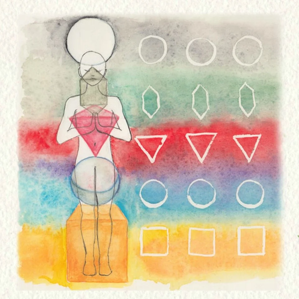 This image is a watercolor painting I made over a decade ago when I was still teaching yoga and Ayurveda. It is an illustration of the classic description of how the 5 Elements show up in the body; a kind of Sacred Geometry. Earth at the base, then Water, Fire, Wind and Space.